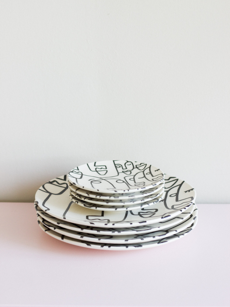 A hand painted dinner plate with graphic design in black and white, made from earthenware. Comes in a set of 2.