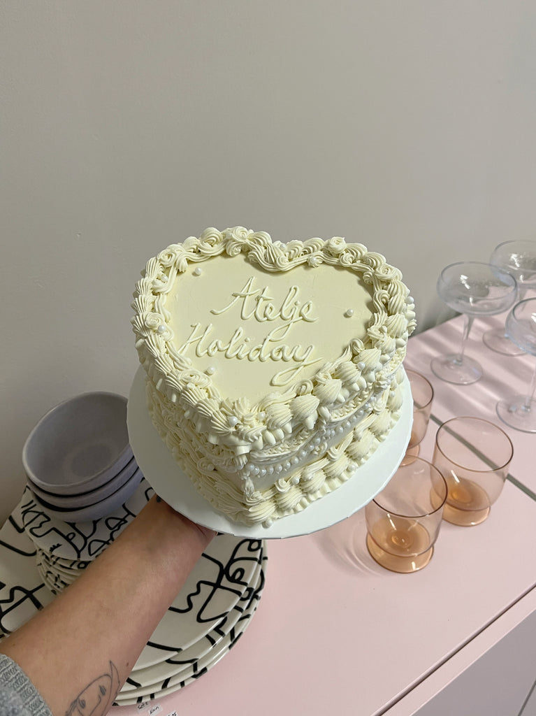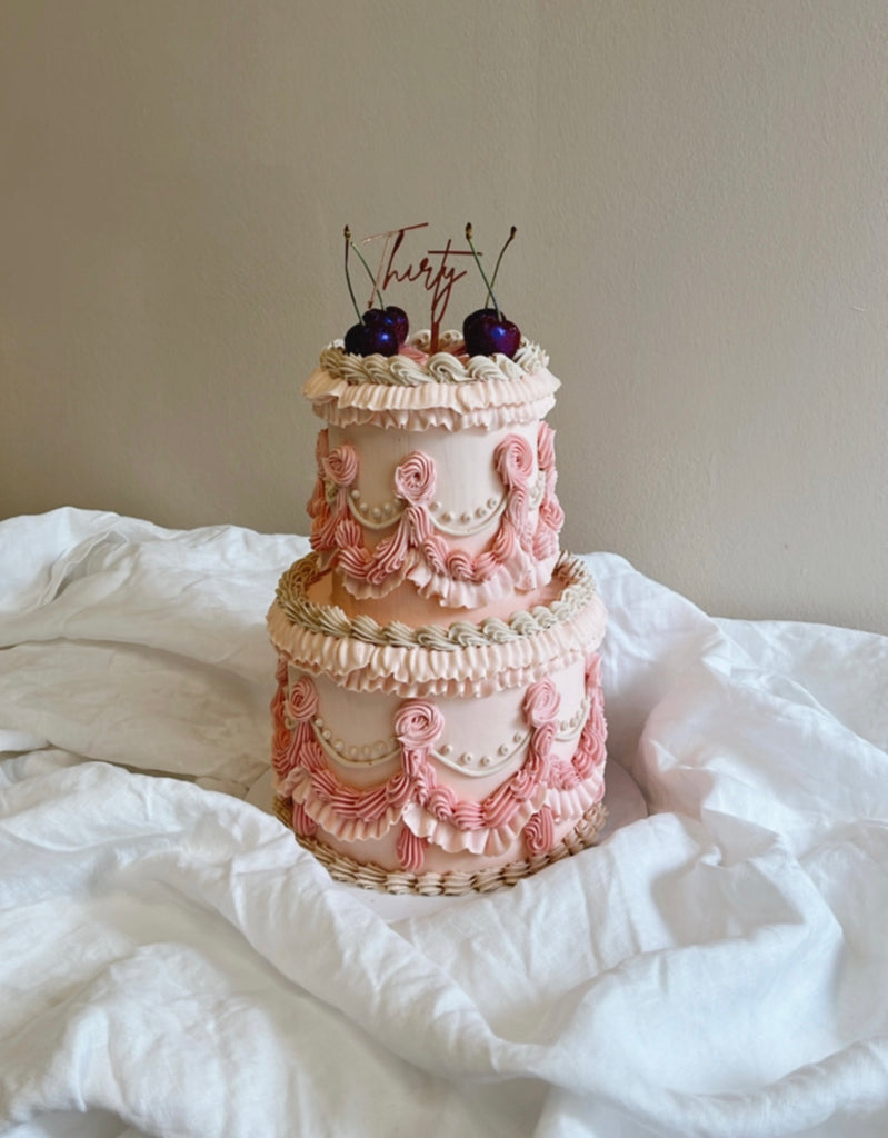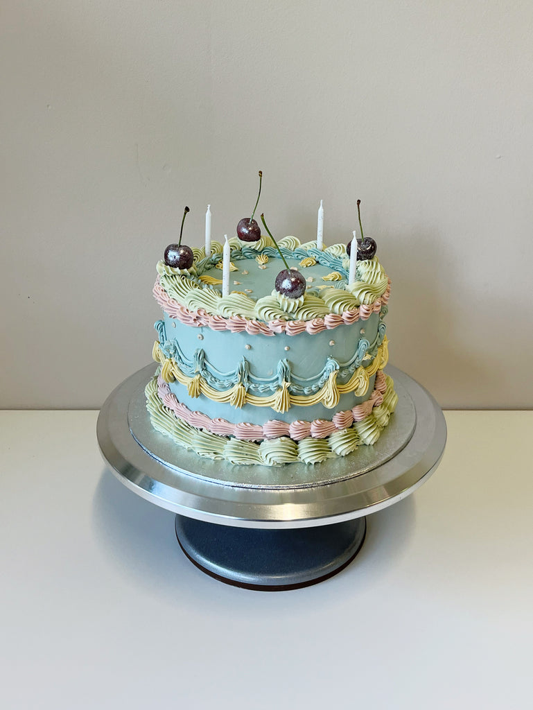 Our retro cakes are all dressed up, you can choose between shape & fonts. If you want to doll it up more add some cherries on top. If you are looking for this style but a bit more simple cake, check out our retro cake.